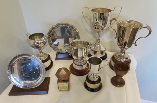 All the trophies. The wooden cup was turned by David Woolley from a section of the walnut tree that grew near the old lawns, and was presented to George Collin for his unstinting work as club groundsman.