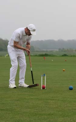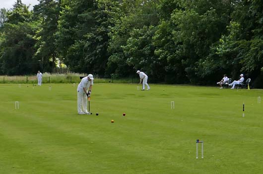 In the afternoon singles John missed a hampered shot after running hoop 5, Brian went to 4-back and took his other ball round in a textbook break, winning shortly afterwards. Nick was less conventional but equally effective, and the end came when Tim failed hoop 4 off partner leaving the balls cross-wired across the hoop. Nick played off the east boundary to a position where he couldn’t be hit. Tim had a go at the sliver of partner showing, but missed and that was that. Tim Nurse found Stephen determined to make up for his loss in the morning, but Peter continued his good form, taking his first ball round to 4-back and then his other ball to peg, leaving a tight diagonal spread described in good humour by his opponent as “a bit cruel”! Jonathon missed the lift and Peter went on to win by +26, gaining 28 index points in the day. Weather sunny and warm, and thanks to Jonathan for lunch.